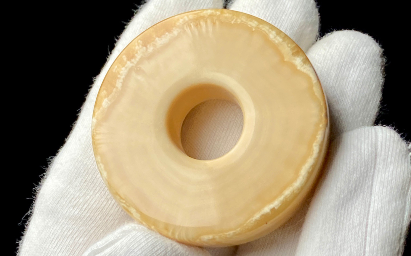 从上图可以看到,这经过大约一年时间把玩的独角牙,变化真的挺明显的。颜色已经从最初的洁白,变成了现在这种更加深沉的黄色,就像是秋天的落叶,带着一种岁月沉淀的美感。
